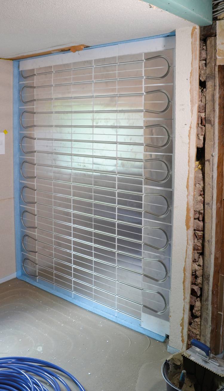 Ein zusätzliches Wandheiz- und -kühlsystem erhöht die Behaglichkeit und dient als „Heiz- oder Kühlbooster“ für eine gewünschte Spitzenlast. Seine Heiz- oder Kühlmitteltemperatur liegt nur geringfügig über beziehungsweise unter der Raumlufttemperatur. Den größten Teil der Wärme strahlt es ab, was als besonders behaglich empfunden wird. Die Dicke der Konstruktion ohne Wandbelag beträgt 35 Millimeter. Eine spezielle Metalloptik-Fliese hebt das Wandheiz- und -kühlsystem optisch hervor.