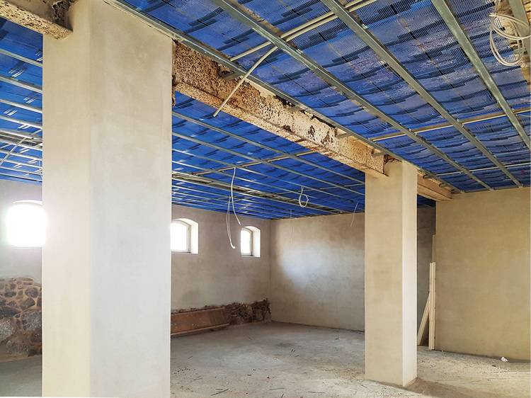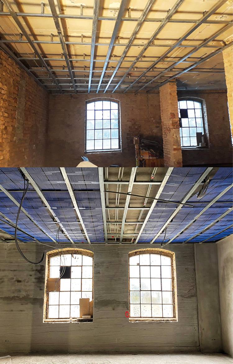 Mit dem Einbau eines Klimasystems geht es in die nächste Phase der Baumaßnahmen. Entschieden haben sich die Bauherren für die Klimadecke von Geo Clima Design, die nicht nur die Heizung, sondern auch die Kühlung der Gebäude gewährleisten kann. Das Heiz- und Kühlsystem erlaubt es, in allen Gebäudeeinheiten effizient und nachhaltig ein angenehmes Klima zu schaffen. Sowohl im Sommer als auch im Winter sorgt die Klimadecke künftig für Behaglichkeit. Die aus Polypropylen bestehenden Kapillarrohrmatten werden hinter Gipskartondecken angebracht. Sie eignen sich ideal für den nachträglichen Einbau in denkmalgeschützten Gebäuden.
