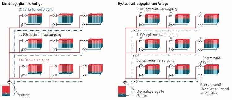 Die benötigten Volumenströme berechnen sich anhand der Temperaturdifferenz, dem ermittelten spezifischen Wärmebedarf und der spezifischen Wärmekapazität des Trägermediums. In weiteren Schritten werden – wenn nötig – die Ventile an den Heizkörpern ausgetauscht und auf die berechneten Wassermengen eingestellt. Zudem wird die Heizungspumpe auf den richtigen Druck und die Heizkurve optimal eingestellt. Letzteres geschieht bei der TacoFlow2 ADAPT Umwälzpumpe von Taconova mit activeADAPT-Funktion besonders effizient und einfach, denn sie passt die Pumpenleistung automatisch an die spezifischen Anforderungen des Systems an.