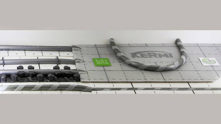 Um Abhilfe zu schaffen, hat Kermi das Verbindungssystem x-net connect für Flächenheizungen entwickelt. Die durchlaufenden Zuleitungen werden nicht in den Estrich eingebettet, sondern ab dem Verteiler in eine Dämmebene unter dem Estrich geführt. Erst außerhalb des mit x-net connect belegten Bereichs verlaufen sie in der Estrichebene.