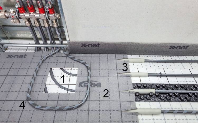 3) Estrichdichter, geprüfter Übergangsbereich der durchlaufenden Zuleitungen in die zu beheizenden Räume, bzw. zu den verschiedenen klassischen x-net Systemen