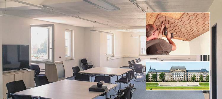Wie eine Nachrüstung in der Praxis aussehen kann, macht das Projekt von Argilla Therm im sächsischen Finanzministerium in Dresden deutlich. Aufgrund der Hitzewellen in den vergangenen Jahren plante der Staatsbetrieb Sächsisches Immobilien- und Baumanagement 2019 eine energetische Sanierung des Dachgeschosses und den Einbau von 1.600 Quadratmeter Kühldecken. Aus ökologischen und baukulturellen Gründen kam nur Lehm als Baustoff für die Deckenkühlung infrage. Die Entscheidung fiel auf das Lehmklima-System von Argilla Therm, unter anderem wegen der höheren Kühlleistung im Vergleich zu den Mitbewerbern bei gleichzeitig deutlich geringeren Investitionskosten.