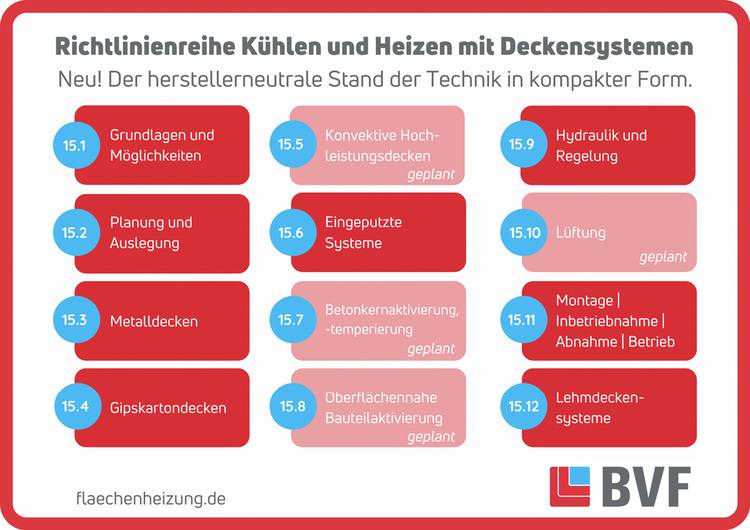 Als praktischen Leitfaden empfiehlt der BVF seine Richtlinienreihe Kühlen und Heizen mit Deckensystemen. Sie stellt detaillierte technische Informationen für alle am Markt gängigen Systemarten und deren Besonderheiten praxisnah dar. Die Richtlinie 15.11 „Montage, Inbetriebnahme, Abnahme und Betrieb“ enthält Abnahmeprotokolle.