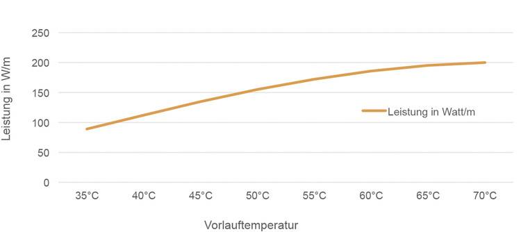 Die Heizleiste erreicht eine Leistung von bis zu 200 W/m bei einer Vorlauftemperatur von 70 °C.