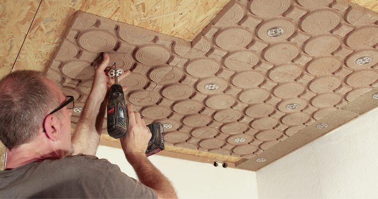 Die Montage der Lehmmodule erfolgt immer an einer flächigen Unterkonstruktion, entweder Vollholzdecken oder OSB-/ESB-Spanplatten. In Objekten mit erhöhten Brandschutzanforderungen werden an Stelle der Spanplatten zementgebundene Faserplatten eingesetzt. Die Span- bzw. Faserplatten können direkt an den Decken oder an geeigneten Deckenabhangkonstruktionen befestigt werden. Die Lehmbauplatten werden gemäß Herstellerangaben an die Unterkonstruktion geschraubt.