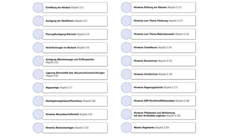 Die Struktur des Kapitels 3 ermöglicht im Rahmen der Planung ein fehlerarmes Arbeiten. Die dazugehörende Checkliste zeigt eine sinnvolle Reihenfolge der einzelnen Schritte. Diese können grundsätzlich natürlich variiert werden. Allerdings ist es dann möglich, dass man an bestimmten Punkten nicht weiterkommt. So kann etwa die Berechnung des hydraulischen Abgleichs nicht ohne die Ermittlung der Heizlast erfolgen.