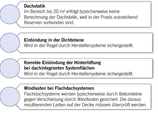 Ergänzend sei noch exemplarisch auf zwei weitere Punkte im Kapitel 3 hingewiesen. So wird bei der Auslegung einer Solaranlage (Kapitel 3.5.10) gerne unterschlagen, dass diese Einfluss auf den Baukörper hat. Die Einbindung in die Dachhaut und insbesondere die Statik können aber ein Problem darstellen. Auch hier hilft das Arbeiten mit der zugehörigen Checkliste, um nichts zu vergessen.