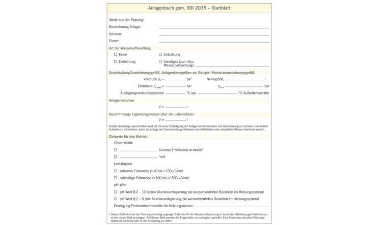 Ein gutes Beispiel ist das im aktuellen Entwurf zur VDI 2035 beschriebene Anlagenbuch. Im Rahmen der Planung wird eine Wasserbeschaffenheit für das Heizungswasser nach VDI 2035 vorgesehen. Der Planer entscheidet sich eventuell für eine salzarme Fahrweise und wählt ein geeignetes Produkt aus. Dies wird auf der ersten Seite des Anlagenbuches dokumentiert. Der ausführende Handwerker kennt damit die zu überprüfenden Werte, weiß, wann Wiederholungsmessungen zu tätigen sind, und hat klare Messvorschriften. Bei der Übergabe der ausgeführten Anlage erstellt er ein weiteres Blatt für das Anlagenbuch, das die nunmehr ausgeführten Tätigkeiten dokumentiert.