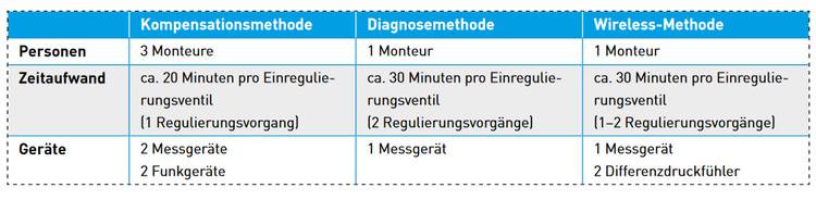 Zu den weiteren Voraussetzungen für alle Verfahren zählt ebenfalls, dass die installierten Einregulierungs- und Partnerventile über Messnippel für den Anschluss eines Messgeräts verfügen, mit dem die exakte Messung der Durchflussmenge sowie des Differenzdrucks vorgenommen wird. Unterschiede weisen die Verfahrensweisen hingegen in Bezug auf den Einsatz von Personal und Technik auf.