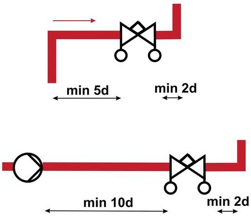 Beim Einbau ist darauf zu achten, dass sich vor den Ventilen mindestens 5 d sowie dahinter mindestens 2 d gerade Rohrstrecke befinden. Wird ein Einregulierungsventil hinter einem Anlagenteil installiert, der Turbulenzen hervorrufen kann – zum Beispiel einer Pumpe – empfiehlt es sich, vor der Komponente eine gerade Rohrstrecke von 10 d zu belassen. Diese Einbauvorgaben haben später eine hohe Messgenauigkeit zur Folge.