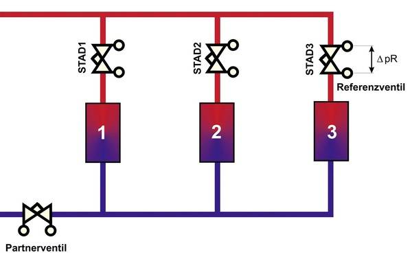 Für alle drei Verfahrensweisen ist es grundsätzlich notwendig, das Rohrleitungssystem in Einheiten bzw. Module zu unterteilen. Üblicherweise bestehen diese aus mehreren Verbraucherkreisen, die vom gleichen Vor- und Rücklauf versorgt werden. Die Kreise besitzen jeweils ein eigenes Einregulierungsventil sowie ein gemeinsames Regulierventil im Heizungsrücklauf – das sogenannte Partnerventil. Die Anzahl und Anordnung der Einregulierungsventile ist bei allen Methoden identisch.