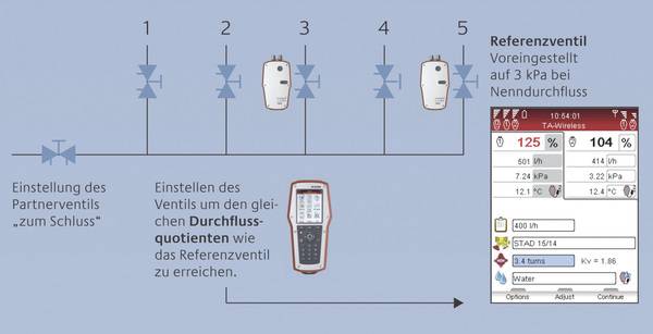 Wie bei der Kompensationsmethode wird hier zunächst das Referenzventil im letzten Verbraucherkreis eines Moduls mithilfe von Differenzdruckfühler und Messcomputer so eingestellt, dass beim gewünschten Nenndurchfluss ein Druckverlust von 3 kPa anliegt. Danach erfolgen der Anschluss des zweiten Dp-Sensors an das Regulierventil des nächstgelegenen Strangs sowie die Messung der dortigen Durchflussmenge. Anschließend muss das Ventil lediglich so eingestellt werden, dass der Durchflussquotient dem des Referenzventils entspricht. Dieser Vorgang wird für sämtliche Ventile der Einheit wiederholt und abschließend dann das Partnerventil eingestellt.