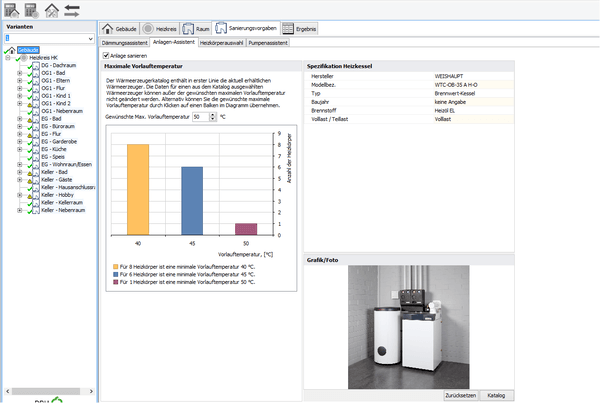 Darüber hinaus ist es mit „Optimus Duo 3D“ möglich, über den Sanierungsassistent Vorlauftemperaturen, energetische Verbesserungen am Gebäude oder der Anlagentechnik zu berechnen. Kundenorientierte Aussagen über den Einsatz von alternativen Wärmeerzeugern oder über andere energetische Schwachstellen können so problemlos getätigt werden.