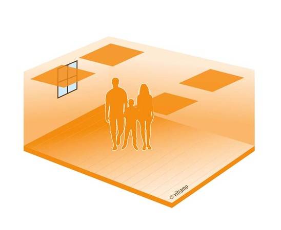 Vitramo Decken-Heizelemente wärmen bei fachgerechter Auslegung die inneren Hüllflächen so differenziert, dass sie untereinander kaum Temperaturunterschiede aufweisen. Die Deckenmontage vermeidet weitgehend Konvektion, die Luftbewegungen im Raum bleiben durch das Strahlungsheizsystem ebenfalls gering. Im normalen konvektiven Heizbetrieb ist ein solcher Temperaturabgleich der Oberflächen nicht möglich, da durch die Konvektion bestimmte Abschnitte der Raum-Hüllfläche besonders aufgeheizt werden, hingegen andere kühl bleiben.