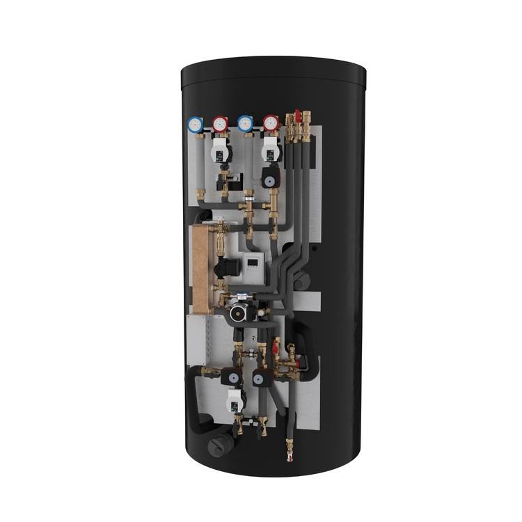 Bei der Bestellung des Hydrauliktowers kann aus verschiedenen Ausstattungen gewählt werden. So ist die Ausführung mit ein oder zwei gemischten oder ungemischten Heizkreisen möglich. Die Frischwasserstation ist mit einem kupfer- oder edelstahlgelöteten Wärmeübertrager erhältlich, mit oder ohne Zirkulation. Bei vorhandener Zirkulation ist ein Speicherschichtungsset vorhanden, das den Rücklauf je nach Temperatur automatisch in den passenden Bereich des Speichers leitet – ein weiteres Plus in Sachen Energieeffizienz. Alle Hydrauliktower sind mit einer Beladegruppe ausgestattet und beinhalten die entsprechenden Verrohrungen der einzelnen Stationen zur flachdichtenden Verbindung am Pufferspeicher.