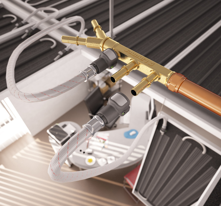 Der MultiQuickConnect von Lindner hat sich als sichere, formschlüssige Schnellsteckverbindung von Heiz- und Kühldeckenelementen und den dazugehörigen hydraulischen Komponenten bewährt. Dabei benötigt der MultiQuickConnect – kurz MQC genannt – keine Haltekrallen, die die Rohroberflächen beschädigen könnten. Zwei O-Ringe sorgen für sichere Dichtebenen und festen Halt. Selbst bei hohen Druckschwankungen wird so ein Verrutschen der Anschlüsse verhindert.