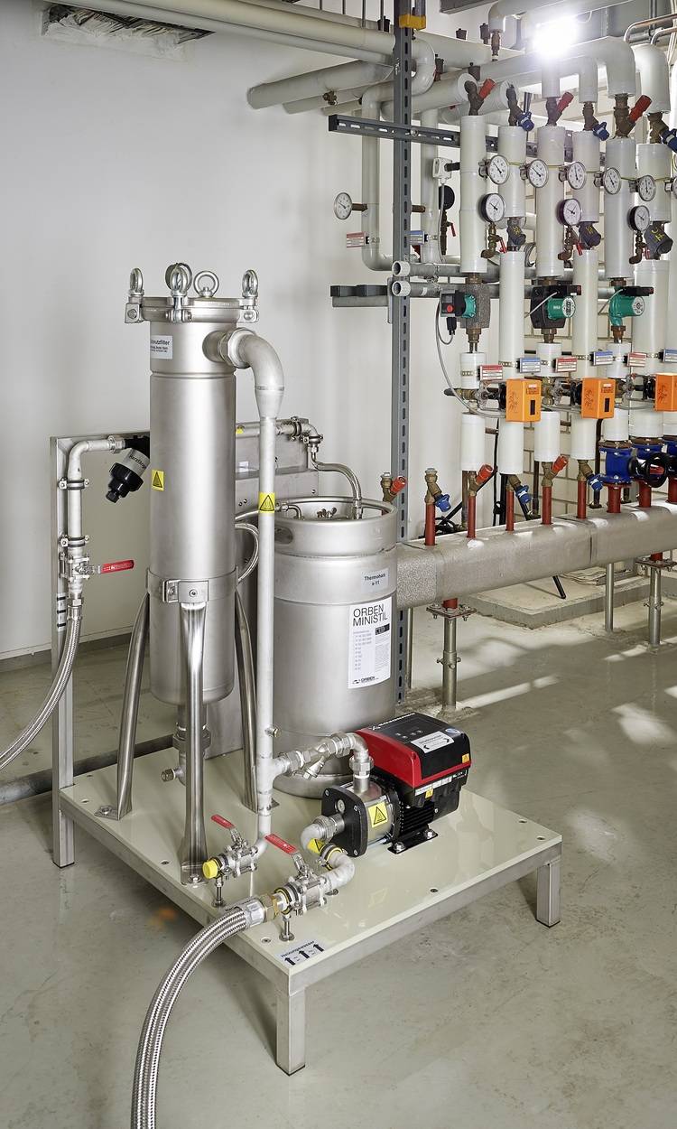 Sehr hartes Wasser mit einer Gesamthärte von über 3,8 Millimol (mmol/l), was in etwa 22 Grad deutscher Härte entspricht, machte eine umfassende Aufbereitung des Leitungswassers notwendig. So wurde das Nachfüllwasser mit vier Orben MINISTIL P102 Patronen aufbereitet und zum bestehenden, aufbereiteten Heizwasser nachgespeist. Die angestrebte Zielleitfähigkeit in der Anlage nach der Nachfüllung betrug 58 μS/cm (Mikrosiemens) und wurde problemlos erreicht.
