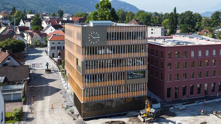 Der Neubau des Rathauses setzt auf einen sechsgeschossigen Holz-Hybridbau mit hoher Energieeffizienz, kreislauffähigen Materialien und einem Low-Tech-Klimakonzept. Besonders interessant: Es werden in Hohenems sogenannte Energiepfähle genutzt.