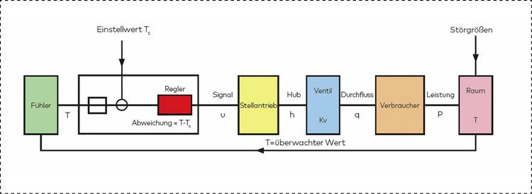Regelkreisläufe, wie etwa bei einer Heizung, bestehen aus einer Reihe von Komponenten, die in einer festgelegten Abfolge wirken (Bild 2) und die Energieversorgung am Verbraucher und damit die gewünschte Temperatur in einem Raum regulieren.