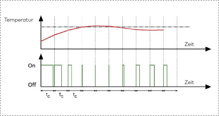 Bei der Pulsweitenmodulation (PWM) wird die Differenz zwischen der Raumtemperatur und dem Sollwert (z.B. 20°C) innerhalb einer Zykluszeit tC dargestellt. Während dieser Zykluszeit wird die elektrische Leistung zum Konvektor für einen bestimmten Zeitraum eingeschaltet, der proportional zur gemessenen Abweichung ist (Bild 5).