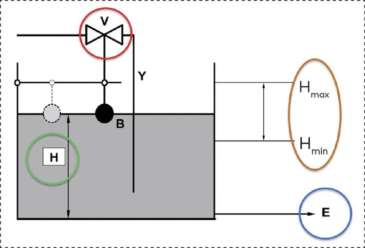 Die Wasserentnahme oder -leckage („E“ in Bild 8) stellt den Wärmeverlust im Raum dar. Der Schwimmer misst den Wasserstand und bewirkt, dass das Ventil langsam und stetig (proportional) öffnet, um Wasser nachlaufen zu lassen – genau wie der Temperaturfühler und Stellantrieb auf einem Regelventil. Der Wasserstand stabilisiert sich daraufhin zwischen einem minimalen und einem maximalen Wert (Hmin, Hmax).