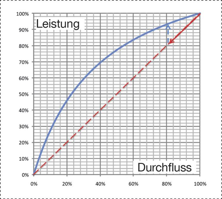 Das Öffnen des Regelventils von null auf 10 % Durchfluss führt daher zu einem sehr schnellen Anstieg der Leistungsabgabe. Am oberen Kurvenende – in Nähe des Nenndurchflusses – gibt der Koeffizient direkt die Steigung der Kurve an. In diesem Bereich der Kurve bewirkt eine Erhöhung des Durchflusses um 10 % einen Leistungsanstieg um das 0,29-Fache von 10 %, also ~ 3 %.