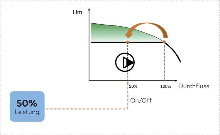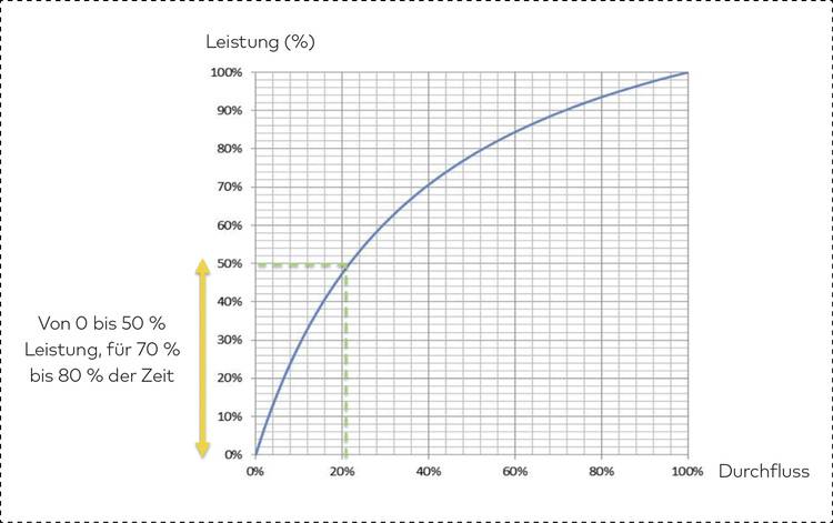 Bei einer On-off-Regelung entspricht eine Durchflussrate von 50 % auch einer Leistung von 50 %. Bei einer drehzahlgeregelten Pumpe, die Hm konstant hält, sinkt der Stromverbrauch proportional zur Durchflussreduktion. Die oben genannte Formel zeigt die Verbrauchskonstante C0, die den Pumpenenergiebedarf bei einer Durchflussrate „0“ widerspiegelt. Diese hängt sehr stark vom verwendeten Pumpentyp ab. Der Energiebedarf bei Nulldurchfluss liegt bei ca. 30 % des maximalen Stromverbrauchs.