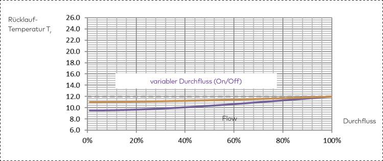 Im reinen On-off-Betrieb liegt die Rücklauftemperatur unabhängig von der Leistung nahe bei 12 °C. Tatsächlich zeigt die violette Kurve (Bild 4) jedoch eine Rücklauftemperatur von etwa 10,5 °C. Dies ergibt sich automatisch durch die gegenseitige hydraulische Beeinflussung. Denn das Wegschalten von Verbrauchern führt zu einer Erhöhung des Durchflusses an den geöffneten Verbrauchern.