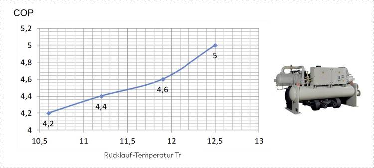 Im Kühlbetrieb wirkt sich die Anhebung der Rücklauftemperatur positiv auf den Wirkungsgrad der Kältemaschinen aus. Das Beispiel in Bild 6 zeigt, dass der COP (Coefficient of performance) der Kältemaschine bei Rücklauftemperaturen zwischen 12,5 °C und 10,5 °C von 5 auf 4,2 absinkt. Das entspricht einem Wirkungsgradverlust von etwa 15 %.