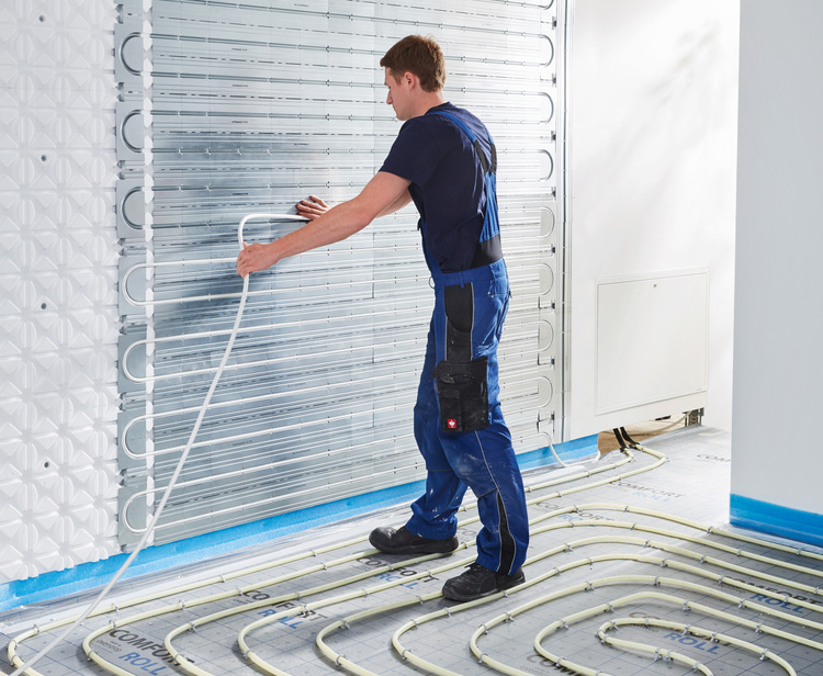 Das Comfort-roll-System für Flächenheizung und -kühlung bietet dem Fachhandwerk alle Bausteine für eine einfache und kostenorientierte Installation. Im Programm sind sämtliche Komponenten von der Festlegung des Untergrunds über das Montagezubehör, Heizrohre, Rohrverbindungen, Werkzeuge sowie Verteiler und Schränke enthalten. Planern steht bei Comfort-roll darüber hinaus ebenfalls das komplette Zubehör für die Regelungstechnik wie Festwertregelstationen, Raumthermostate, bidirektionale Funk-Thermostate und Funkempfänger zur Verfügung.