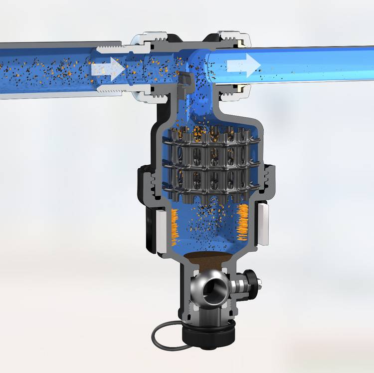 - Eine im Volumenstrom angebrachte Brücke trennt alle im Medium vorhandenen Verunreinigungen. Deren Funktionsprinzip ist dabei so einfach wie genial. Die Brücke erzeugt eine Turbulenz innerhalb des Volumenstroms. Dadurch werden die Verunreinigungen in die Dekantierkammer geleitet. Auf dem Weg dorthin passieren sie mehrere, radial angeordnete Netzflächen. Durch deren spezielles geometrisches Konzept wird die Strömungsgeschwindigkeit so weit herabgesetzt, dass die Verunreinigungen problemlos durch Schwerkraft in die große Sammelkammer absinken.