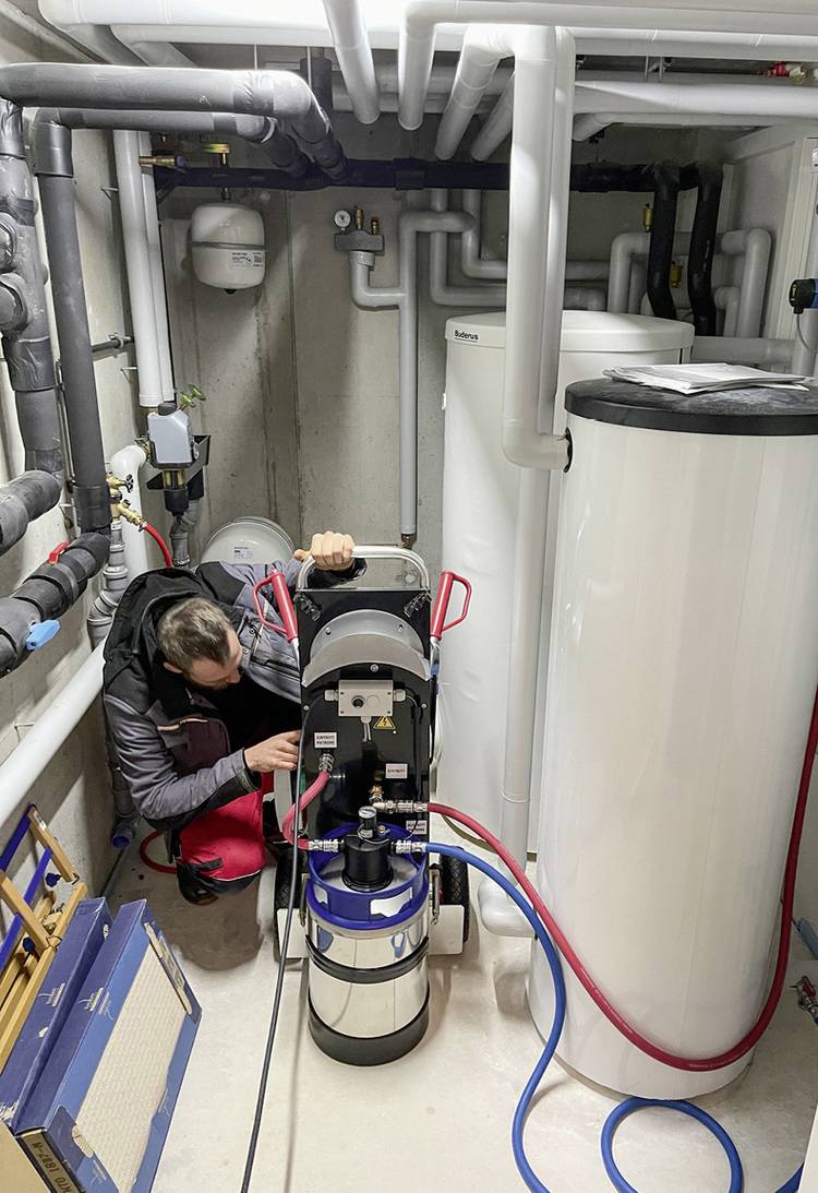 Für eine einfache und zeitsparende Aufbereitung nutzt das Fachhandwerksunternehmen Walz aus Steinenbronn ein mobiles System. Die Aufbereitung erfolgt dabei im Bypassverfahren bei laufender Anlage, alle notwendigen Anlagenkomponenten sind mobil anschlussfertig auf einer Transportkarre montiert. Da auslaufsichere Spezialverbinder eingesetzt werden, kann die Umwälzung auch ohne Beisein des Handwerkers über Nacht erfolgen.