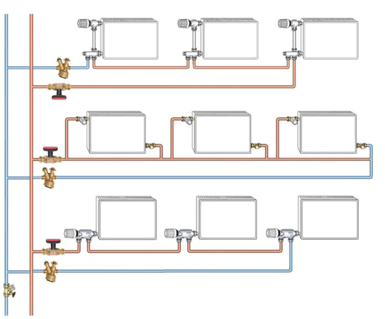 Die Ventile werden im Vor- oder Rücklauf des jeweiligen Einrohrrings installiert und die erforderliche Ringwassermenge direkt eingestellt. Auf diese Weise findet automatisch ein hydraulischer Abgleich im Gesamtsystem statt und die Über- bzw. Unterversorgung ganzer Ringe – zum Beispiel durch schließende Nachbarventile – wird zuverlässig vermieden. Komplexe Berechnungen oder detaillierte Kenntnisse des Rohrleitungssystems sind hierzu nicht erforderlich.