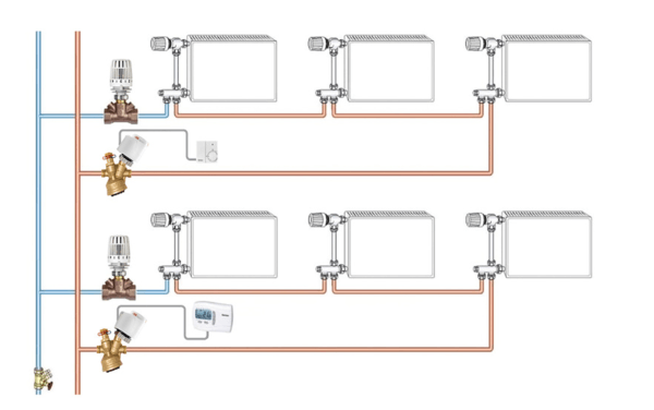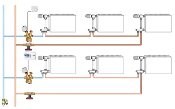 Weitere Möglichkeiten zur Systemoptimierung bietet das Regel- und Regulierventil im Zusammenspiel mit zusätzlichen Armaturen aus dem Produktsortiment des Herstellers. So lässt sich mit dem Ventil in Kombination mit einem thermischen Stellantrieb und einem Raumthermostat für die Heizkörper eines Einrohrrings eine präzise Zonenregelung realisieren. Über das Raumthermostat kann darüber hinaus eine energiesparende Nachtabsenkung programmiert werden.