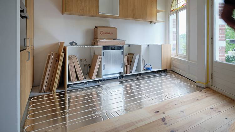 Die Wohnung aus dem Jahr 1915 befindet sich im zweiten Stock eines denkmalgeschützten fünfstöckigen Gebäudes mit Blick auf den Plantage-Muidergracht-Kanal. Die Küche sollte renoviert und der alte Heizkörper entfernt werden. Die Herausforderung: nur 20 mm Platz zwischen dem Unterboden und den Fliesen.