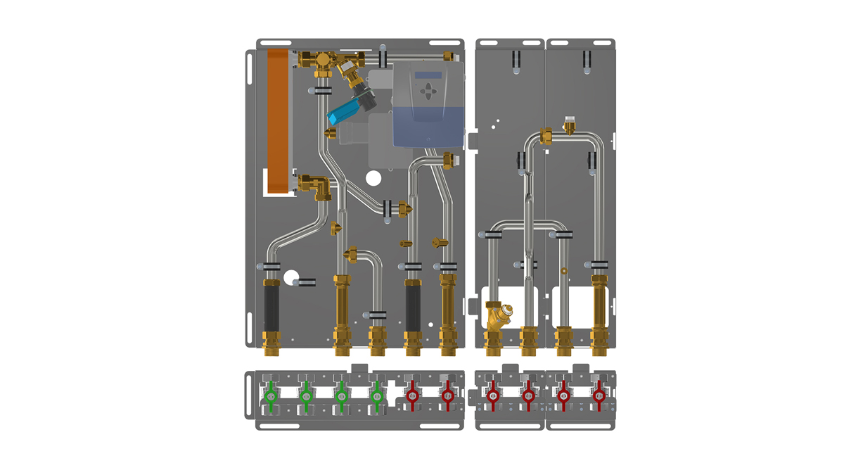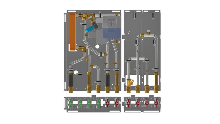 Für die Raumwärmeversorgung gibt es Module für ungemischte und gemischte Heizkreise, ein Vier-Leiter-Modul sowie ein Drei-Leiter-Modul (hierbei nutzen Basismodul und Drei-Leiter-Modul den heizungsseitigen Rücklauf gemeinsam). Der Regler VarCon211 managt die Warmwasserbereitung, steuert die optionale Zirkulationspumpe, übernimmt die bedarfsgerechte Temperaturvorhaltung auf der Heizungsseite und bietet zusätzlich eine witterungsgeführte Heizkreisregelung.