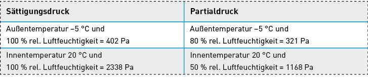 Dabei wird für die winterliche Tauwasserperiode über 2160 Stunden (90 Tage) von einer konstanten Außentemperatur von -5°C bei einer relativen Luftfeuchte von 80% ausgegangen. Der beheizte Innenraum wird mit 20°C und einer relativen Luftfeuchte von 50% angenommen.