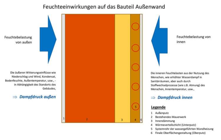 - von außen (Witterungseinflüsse wie Schlagregen, Kondensat, Bodenfeuchte, mittlere Außentemperatur usw.) und