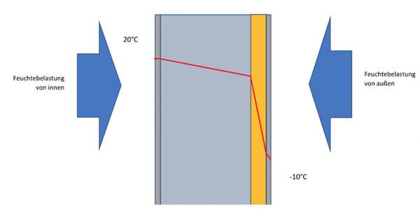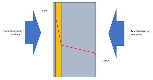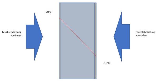 Aufgrund des Dampfdruckgefälles, welches eine Überdrucksituation darstellt, diffundiert in einem Gebäude die vorhandene warme, feuchte Raumluft von innen durch die Außenwand hindurch.
