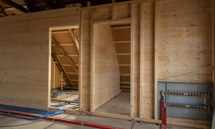 Im Ober- und Dachgeschoss setzten die Planer auf das Wandflächen-Heiz- und Kühlsystem Roth Rohrfix. Es zeichnet sich durch seine hohe Flexibilität mit Blick auf die Verlegeformen und -abstände aus und ist daher besonders für anspruchsvolle Raumgeometrien geeignet. Hier wird das Roth Systemrohr auf den Roth Rohrfix Schienen aufgebracht, anschließend lässt sich der Putz – in diesem Fall ein nachhaltiger Lehmputz – einfach auf ein Armierungsgewebe auftragen.