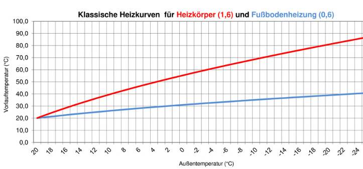 Anhand von reinen Zahlenwerten lässt sich aber kaum der Verlauf einer HKU abschätzen. Dieser Verlauf wird daher grafisch abgebildet. Die beiden genannten Beispiele für eine Fußbodenheizung und eine Heizkörperinstallation werden daher als klassische Beispiele mit dem typischen Kurvenverlauf dargestellt und auf diese Weise gut lesbar.
