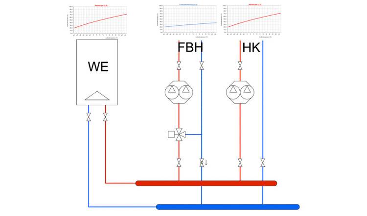 Wenn Heizkörper (HK) und Fußbodenheizung (FBH) von einem Wärmeerzeuger (WE) bedient werden sollen, fährt der WE die Heizkurve der HK. Eine Beimischschaltung regelt dann die Heizkurve der FBH.
