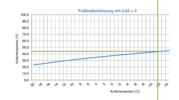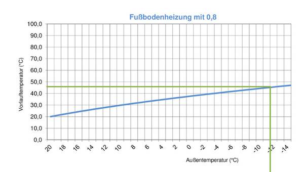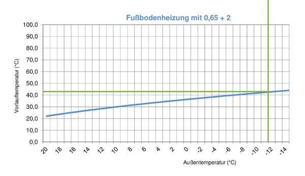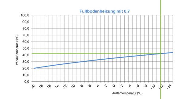 Die Nummerierung der Heizkurven erfolgt nach einem logischen Rechenschema. Anhand eines Beispiels kann man dieses Schema leicht erkennen. Geht man davon aus, dass ein Raum auf 22 °C erwärmt werden soll und der dort verbaute Heizkörper für eine Vorlauftemperatur von 70 °C ausgelegt wurde bei einer tiefsten Außentemperatur von minus 12 °C, dann gilt: