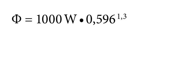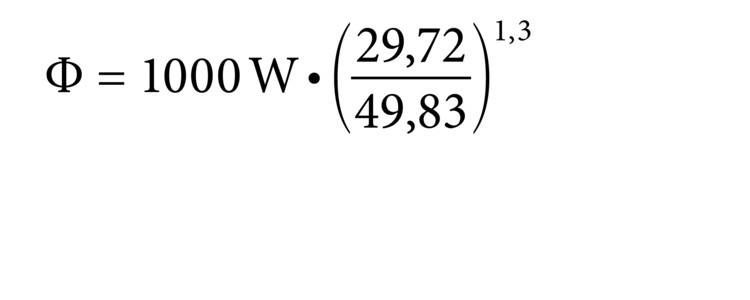 Man setzt diesen Wert jetzt in die endgültige Formel ein. Dabei ist noch wichtig, mit welchem Exponenten gearbeitet werden soll. Für diesen Heizkörper nehmen wir einen Exponenten von 1,3 an. Dann entwickelt sich die Formel zu: