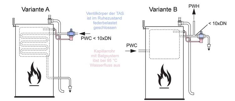 Bei der selteneren und etwas veralteten Variante B dient der Festbrennstoffkessel zur Trinkwassererwärmung. Hierzu muss also ein ständiger Trinkwasserdruck auf dem Kessel lasten, will man doch zwischendurch warmes Wasser zapfen. Bei Überhitzung reagiert die TAS im Warmwasseranschluss dieses Kessels, also auf der Entnahmeseite, und entlässt Warmwasser in einen Abfluss. Die TAS simuliert quasi eine Warmwasserentnahme, was zum Zufluss kalten Wassers und somit zur Temperaturabsenkung führt.