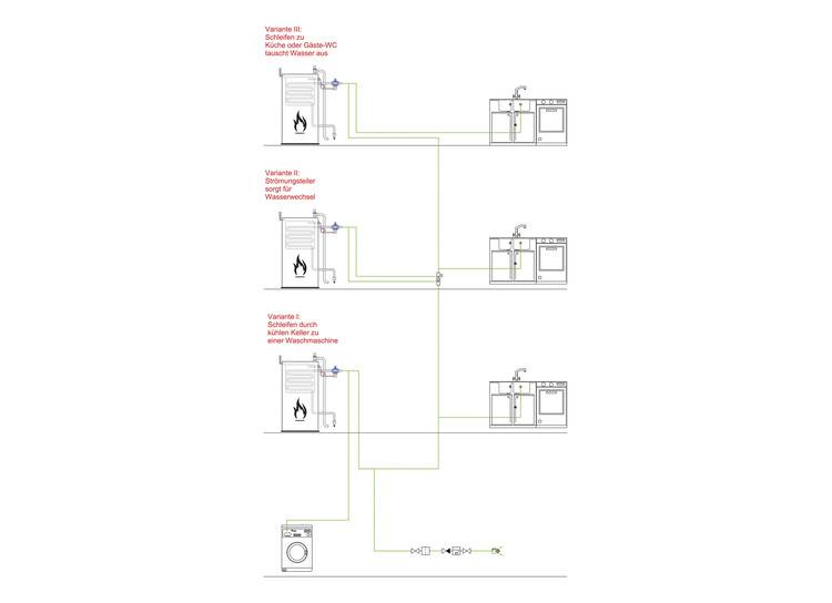 Eine Leitung mit kaltem Trinkwasser könnte sich in der unmittelbaren Nähe dieser Vor- und Rückläufe erheblich erwärmen. Daher ist hier besonders auf eine akkurate Dämmung und einen Mindestabstand zwischen der kalten Trinkwasserleitung und dem warmgehenden Vor- und Rücklauf zu achten.