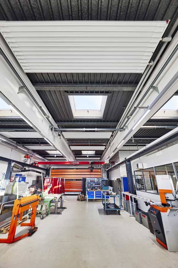 Dies war ein entscheidender Faktor bei der Ausstattung des Offenburger Werkstattgebäudes. Die Decke ist dort nämlich mit zahlreichen quadratischen Oberlichtern bestückt, die von den Deckenstrahlplatten nicht verdeckt werden durften. Das „Umschiffen“ dieser Deckenöffnungen erforderte ein enormes Maß an Flexibilität bei der Planung und Montage, wie der Servicetechniker berichtet: „Durch den Einsatz von insgesamt 50 einzelnen Deckenstrahlplatten fielen sehr viele Verbindungen und Einzelstellen an.