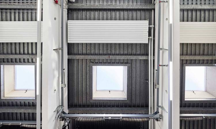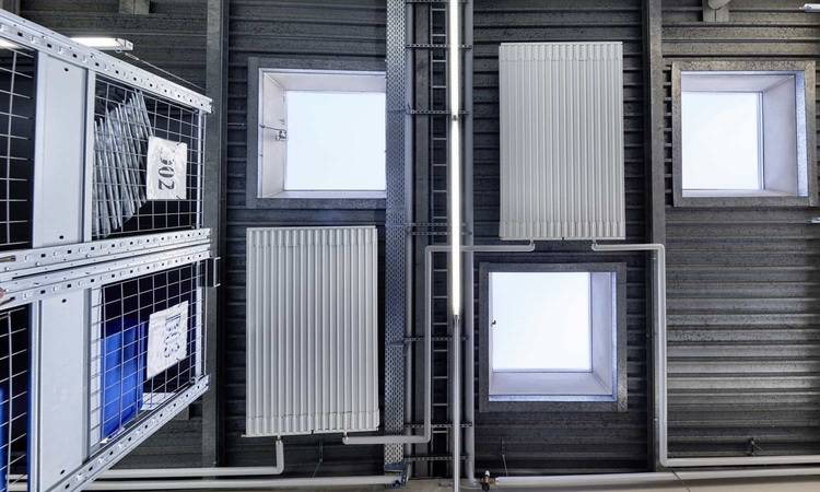 Die einzelnen Längen reichen von 2000 bis 4000 mm mit Breiten zwischen 900 und 1350 mm. Insgesamt bemisst sich die Fläche der 50 Deckenstrahlplatten auf 168 m2. Betrieben werden sie mit einer witterungsgeführten Heizungsregelung mit einer Auslegungstemperatur von 70 °C (Vorlauf) und 50 °C (Rücklauf) bei einer Außentemperatur von -12 °C, die Raumtemperatur liegt bei 18 °C. „Diese geringen Vorlauftemperaturen wirken sich absolut energieeffizient und damit nachhaltig auf den Heizbedarf aus, was uns ja sehr am Herzen liegt“, so Heizmann.