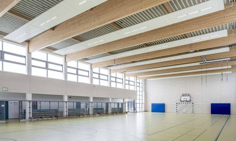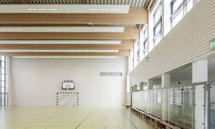 Zehnder ZFP Deckenstrahlplatten: Wärme und Beleuchtung für Turnhalle