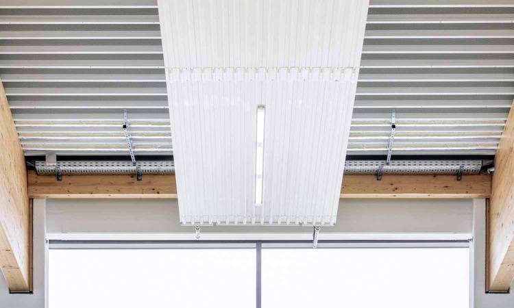 Auch die Einbringung und Montage der insgesamt acht Zehnder Deckenstrahlplatten gestaltete sich für alle Beteiligten sehr zufriedenstellend und zudem zeitsparend. Für die Befestigung griff man auf ein Kettensystem zurück, das an der Trapezfläche der Turnhallendecke montiert wurde. „Die Kombination der Trapezfläche mit dem Kettenabhängesystem ist geradezu optimal, da ich quasi unendlich viele Befestigungspunkte wählen kann und somit sehr flexibel bei der Montage bin“, so der Architekt.